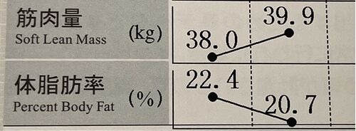 見たまえ、私が2ヶ月間取り組んだ健康改善の結果を 健康改善に取り組んだので、業務用の体組成計で測定してもらいましただよぉ〜。 ズビャァァァン。 私のお仲間には栄養士さんがいて、測ってもろて栄養指導を受けたのですよ 5月の指導では、特に「腕」の筋…